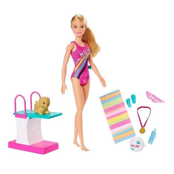 - The Barbie Dreamhouse Adventures Swim ‘n Dive Doll comes wearing a striped colourful swimwear with shimmery accents and includes a diving board, a puppy friend that doubles as a squirt toy, a pair of sunnies, a gold medal accessory, a water bottle, a pair of sandals and a towel.
