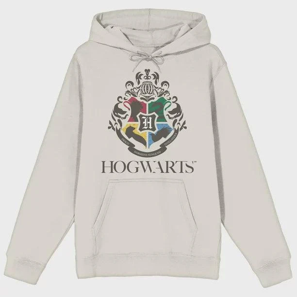 Conjure up some comfort with this Harry Potter sweatshirt. The hoodie features a simple design of the Hogwarts crest with the four house colors and mascots. White letters on a black banner below the crest spell out the magical school’s motto. The sweatshirt comes in a natural color and is equipped with an adjustable hood and a large pouch pocket. Fans of the Harry Potter books and movies will love this cozy hoodie.