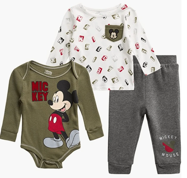 - Disney Baby Boys’ Mickey Mouse Pants Set – 3 Piece Fleece Shirt, Joggers, and Bodysuit