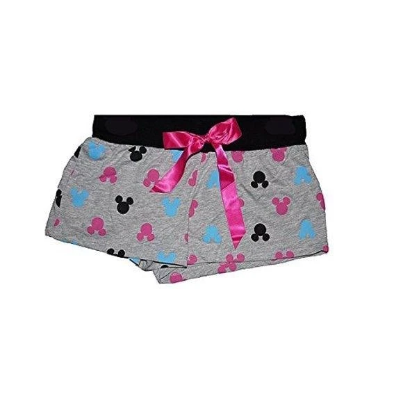 Disney Gray Pajama Boxer Shorts with Colorful Mickey Mouse Heads and Black Satin Bow