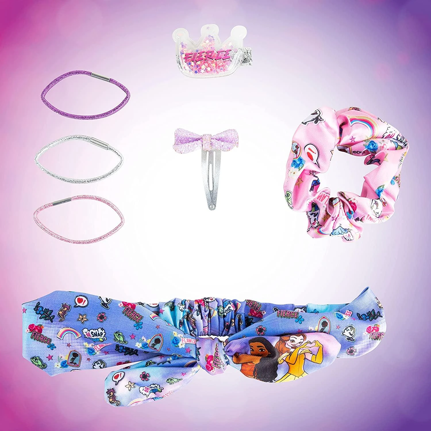 Disney Princess Hair Accessories Handbag – Exclusive Princess Accessory Bag – 7 Pcs Hair Styling Set – 2 Hair Clips – 1 Graphic Designed Scrunchie – 3 Sparkly Pony Holders