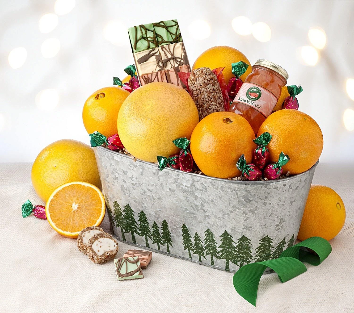 Our planter-style tin tub is brimming with all the good things the holidays have to offer – Navel Oranges, plump Ruby Red Grapefruit, a Florida chocolate assortment, Marmalade and a nougat-filled pecan log, all accented with hard fruit candies. When the goodies are gone, the festively patterned tub is a wonderful, decorative piece. Such an impressive gift!