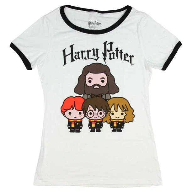 Harry Potter Series Hermione Ron Harry And Hagrid Chibi Juniors Ringer T-Shirt (X-Large) Harry Potter is the most popular fantasy novel series ever, a truly beloved bool series that will remain a favorite for years to come. Harry Potter, Ron Weasley and Hermione Granger along with Hagrid are some of the most popular of the characters. This officially licensed tshirt from Bioworld, the leader in pop culture apparel, is perfect for any fan of the wand waving collection. This soft Cotton/Polyester blend tee is white with a black ring around the neck and sleeves. The front features a fun colorful graphic of the favorite trio and their pal in a anime style print.