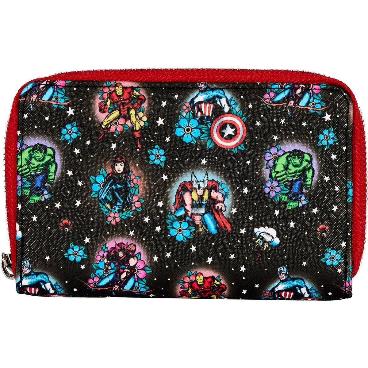 Assemble a superhero team to help you power through your day with this Avengers Floral Tattoo Zip Around Wallet. Captain America, the Hulk, Iron Man, Thor, the Black Widow, and Hawkeye gather in a classic rose tattoo motif on this zip around wallet. A galactic star pattern serves as a background. It’s the perfect accessory for carrying your valuables in superhero style.