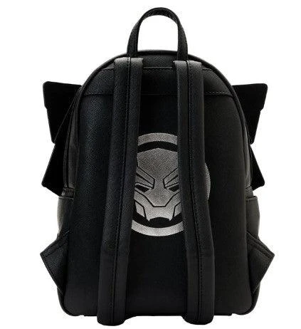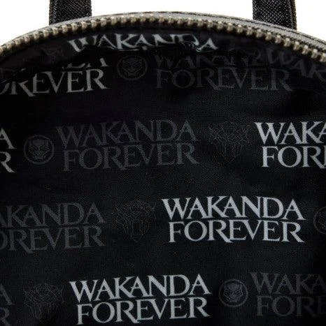 The Loungefly Black Panther: Wakanda Forever Figural Mini Backpack is made of vegan leather (polyurethane). Backpack has adjustable shoulder straps and sturdy metal hardware. Additional features include applique, debossed, and printed details. Take note of the coordinating inside lining.