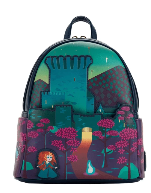 Feast your eyes on the Brave Princess Merida Castle Mini Backpack. As Merida questions whether she can change her fate, she encounters a mysterious will-o’-the-whisp in the forest outside her kingdom. When the daylight fades, the will-o’-the-whisp glows in the dark to illuminate her path. Turn the bag around to find a touching scene of Merida reuniting with her mother in bear-form. This beautifully detailed mini backpack has room for all your adventure essentials and is destined to join your Disney-Pixar Loungefly collection.