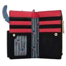 Disney Lilo & Stitch Vampire Stitch Bow Tie Flap Wallet is made of vegan leather (polyurethane). Wallet snaps closed, has sturdy metal hardware, and features: applique, embroidered, debossed, and printed details. Take note of the coordinating pattern of the inside lining fabric.