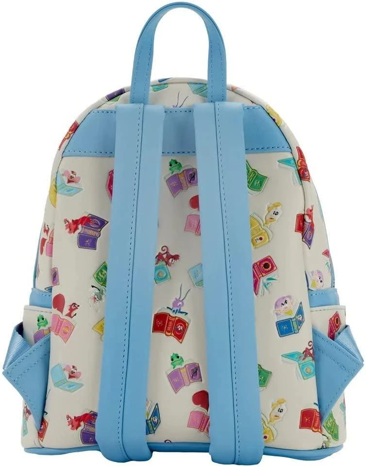 Hit the books like a real Disney Princess: effortlessly! Maintain a smart and stylish look with this Disney Princess Books Classics Mini Backpack. The front zipped compartment of the bag displays gold-detailed spines of books for classic tales that include Beauty and the Beast, Aladdin, Sleeping Beauty, Cinderella, and Snow White and the Seven Dwarfs. The cream-colored background carries a motif of each princess’s pals really getting into Disney Princess books. You might be able to spot Abu, Sebastian, Lumiere, Cri-Kee, Jaq, a very thoughtful squirrel, Pascal, Ray, Dopey, and Flit. This backpack makes for a great complement to any Disney outfit and is perfect for fans wishing to keep their favorite animated movies close. Note the coordinating lining.