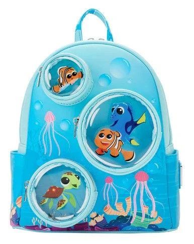 The Loungefly Finding Nemo 20th Anniversary Bubble Pockets Mini Backpack is made of vegan leather (polyurethane). Bag has adjustable shoulder straps and sturdy metal hardware. Additional features include applique, debossed, clear PVC, and printed details. Take note of the coordinating inside lining.