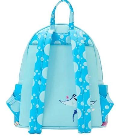 Take a tour of the big blue with the Loungefly Finding Nemo 20th Anniversary Bubble Pockets Mini Backpack! Journey to the ocean floor with Nemo, Marlin, Dory, and Squirt as they float in transparent bubble zipper pockets through a field of glow-in-the-dark jellyfish. Turn the bag around to see Crush and Bruce drift along the side pockets, and join Mr. Ray as he teaches his students below the bag’s bubble-covered shoulder straps. Perfect for adventures on land or sea, this maritime accessory adds a splash of fun to any outfit.