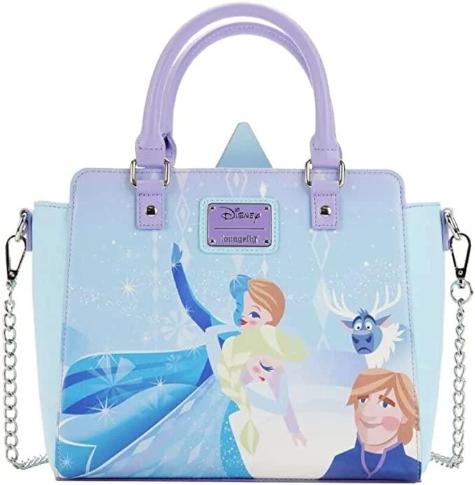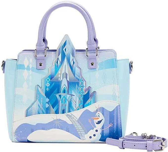 Glide along a shimmering frozen wonderland with Olaf on this Frozen Queen Elsa Castle Cross Body Bag. On the front of the bag, Olaf slides on the ice in front of the palace, which reaches up and over the top of the purse and glimmers with iridescent silver foil details. On the back, Elsa, Anna, Kristoff, and Sven make an appearance. This accessory complements any Disney outfit and is perfect for fans who are looking to keep their favorite animated moments close.