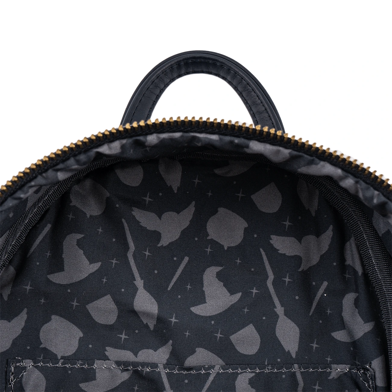 The Harry Potter Diagon Alley Sequin Mini Backpack is made of vegan leather (polyurethane). Bag has adjustable shoulder straps, sturdy metal hardware, and features: foil, and printed details. Take note of the coordinating pattern of the inside lining fabric.