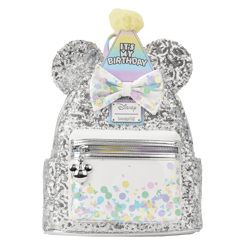 The Loungefly Disney Mickey Mouse and Friends Birthday Celebration Mini Backpack is made of vegan leather (polyurethane). Bag has adjustable shoulder straps, side pockets, a removable applique party hat, and shiny silver-colored metal hardware. Additional features include applique, printed, zipper charm, sequin, and 3D PVC bow details. Take note of the coordinating inside lining.