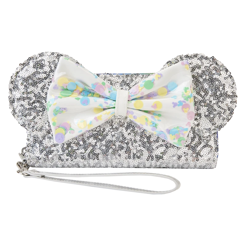 It’s a piece of cake to pull off a festive look with our Loungefly Disney Mickey Mouse and Friends Birthday Celebration Zip-Around Wallet. The 3D PVC bow holds colorful confetti sequins, and if you look carefully, you might spot some “hidden Mickeys.” The entire wallet is covered in shiny silver sequins, including the signature ears that stick up on top. Inside, there are 8 slots for holding cards and 1 clear slot for displaying your ID. A die-cut shape of a Mickey Mouse balloon adds a celebratory touch. Sparkle and shine wherever you go with this charming accessory.