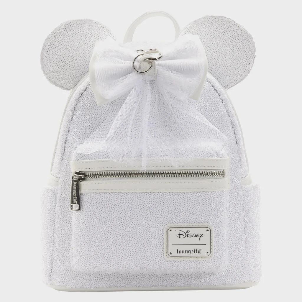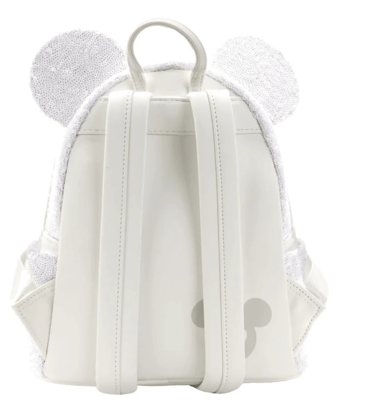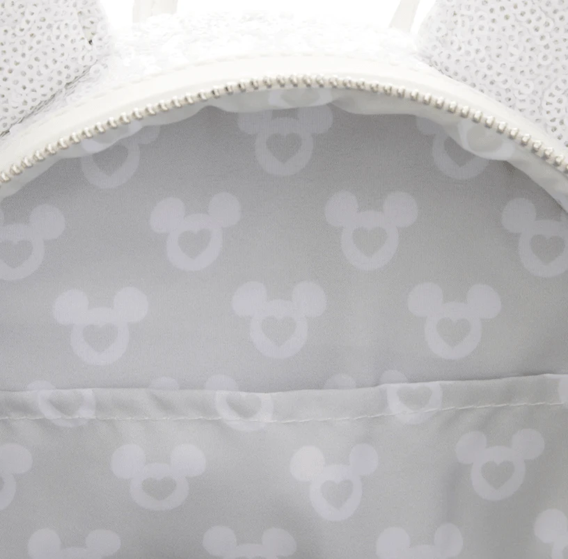 The Loungefly Minnie Mouse Sequin Wedding Mini Backpack is made of vegan leather (polyurethane). Bag has adjustable shoulder straps, sturdy metal hardware and 3D interchangeable bows. Additional features include sequin, applique, debossed, and metal ring details. Take note of the coordinating inside lining.
