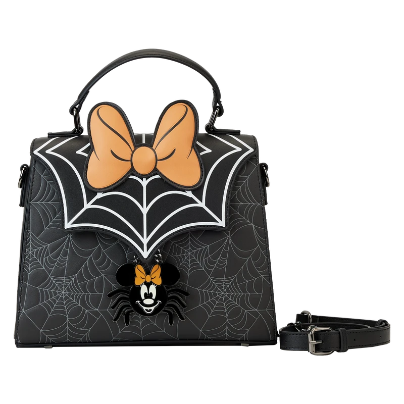 Yoo-hoo and boo! Be scary fashionable with our Loungefly Disney Minnie Mouse Spider Crossbody Bag. The front flap for this spooktacular accessory takes the shape of a spider web. From it, an enamel charm of Minnie Mouse as a spider hangs on a rivet. Minnie’s classic bow, in orange, rises up over the top. A debossed all-over print of spiderwebs creates an elegant design. In the dark, the web on the flap, along with Minnie Mouse’s face on the enamel charm, glow. On the back, a print of Mickey Mouse as a spider hangs from a spider web. Take off on spirited adventures and leave a delightfully haunting impression wherever you go.