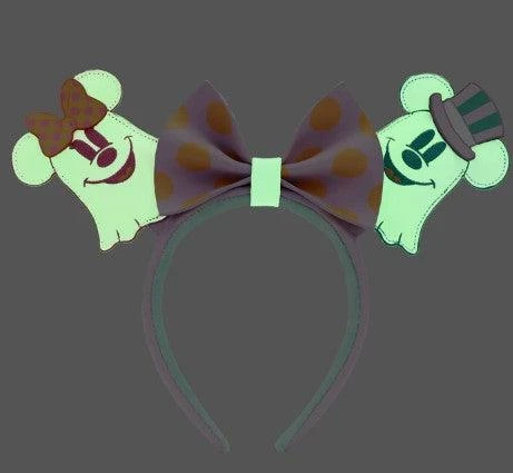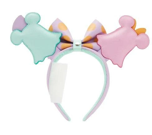 Boo-tiful adventures await with this Loungefly Disney Pastel Ghost Mickey Mouse and Minnie Mouse Ears Headband. It’s just the thing to wear on any spirited trip. This hauntingly charming headband, in violet, features Minnie Mouse’s bow with orange polka dots for a delightful twist on her classic look. On either side, Mickey and Minnie Mouse materialize as ghosts for the ears. Minnie Mouse’s ghost is a soft pink with an orange bow, and Mickey Mouse’s ghost is a greenish blue. He wears a violet top hat with green stripes for a frightfully formal, yet fun look. Applique, printed, and embroidered details bring these cherished Disney characters to life. It’s the perfect accessory to wear on a ghost tour—or to boost your spirits on everyday outings. Check out the Loungefly embroidery on the side.