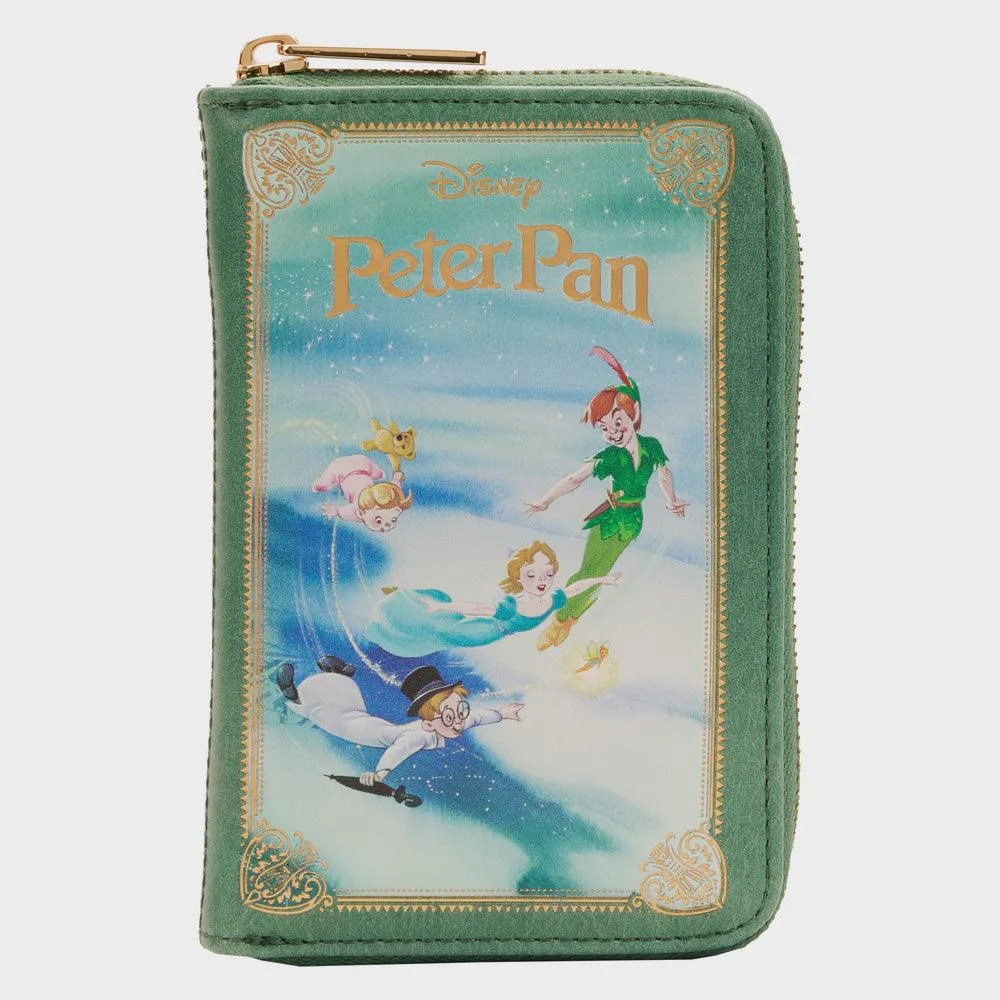 Celebrate the childlike wonder of Disney’s Peter Pan with a charming interpretation of the animated classic! The Loungefly Peter Pan Book Zip Around Wallet portrays the story of the boy who never grew up. Resembling a book cover, the front of this wallet features Peter Pan and the Darling siblings as they fly through the night sky. Gold foil details portray the title and book cover framing. On the back, Peter sits above a compass while playing his flute for Tinkerbell. The phrase “never grow up…” is displayed in a bookish script. With four slots for holding cards and a clear slot to hold your ID, this wallet will keep your important items safe as you take flight on any adventure.