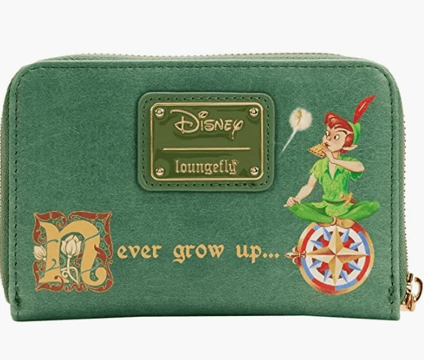 The Loungefly Peter Pan Book Zip Around Wallet is made of vegan leather (polyurethane). Wallet zips closed, has sturdy metal hardware, and features printed details. Take note of the coordinating inside lining.