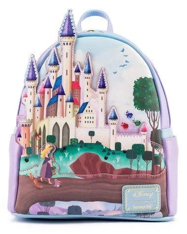 Live happily ever after with this Loungefly Sleeping Beauty Castle Mini Backpack. Since 1959, Disney’s Sleeping Beauty has enchanted audiences with the possibility of “love’s true kiss.” Spells can be broken, with just a little fairy dust, and the interior lining of this backpack carries a magical fairy godmother motif to guard your possessions.