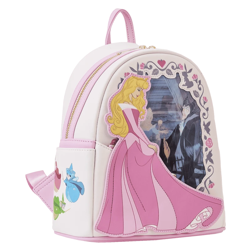 Dream up enchanting adventures with our Loungefly Disney Sleeping Beauty Princess Lenticular Mini Backpack. Disney’s Aurora graces the front, and she looks into a window, which reveals her future: she and Prince Phillip are dancing! Lenticular details, though, offer an alternate view in which she pricks her finger on the spindle of a spinning wheel, thus fulfilling Maleficent’s curse. Debossed flowers and woodland creatures frame the window, and a diagonal zipper behind Aurora’s pink flowing dress allows you to secure smaller items for all your journeys. On the side pockets, you’ll find the Good Fairies (Merryweather, Flora, and Fauna) and a woodland squirrel with flowers. Aurora and Prince Phillip dance together in an encore appearance on the back. Make a dreamy entrance wherever you go with this stylish vision of a backpack.