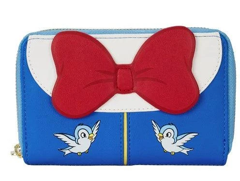 “With a smile and a song,” woodland creatures lend a hand to cheer Snow White. Their adorable presence is wrapped up with a bow on this 85th Anniversary Collection Loungefly Snow White 85th Anniversary Cosplay Zip Around Wallet. On the front of the wallet, two birds flock to the scene, framing a red bow, which covers the front flap. On the back, another woodland creature appears, near colorful flowers, against a yellow background. Note the coordinating inside lining, which includes a special 85th Anniversary Collection motif of Snow White and various woodland creatures. This wallet is the perfect accessory to complete any Disney outfit.
