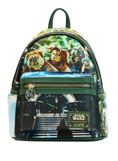 The Loungefly Star Wars: Return of the Jedi Mini Backpack is made of vegan leather (polyurethane). Bag has adjustable shoulder straps, sturdy metal hardware, and features printed details. Take note of the coordinating inside lining.