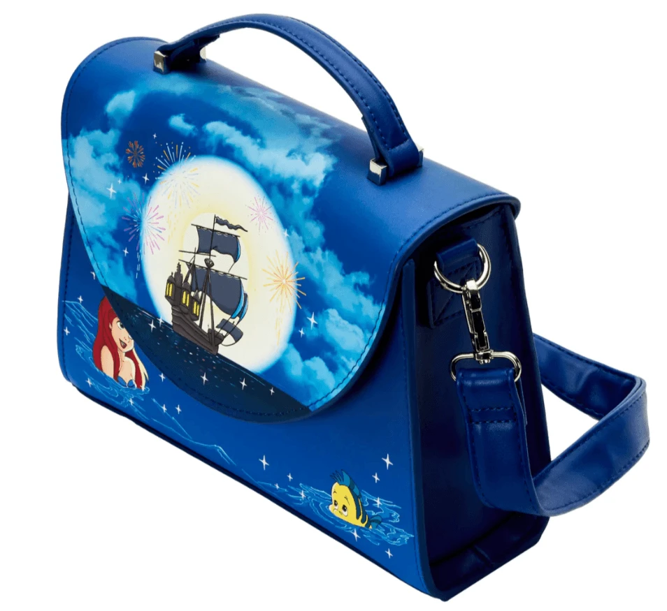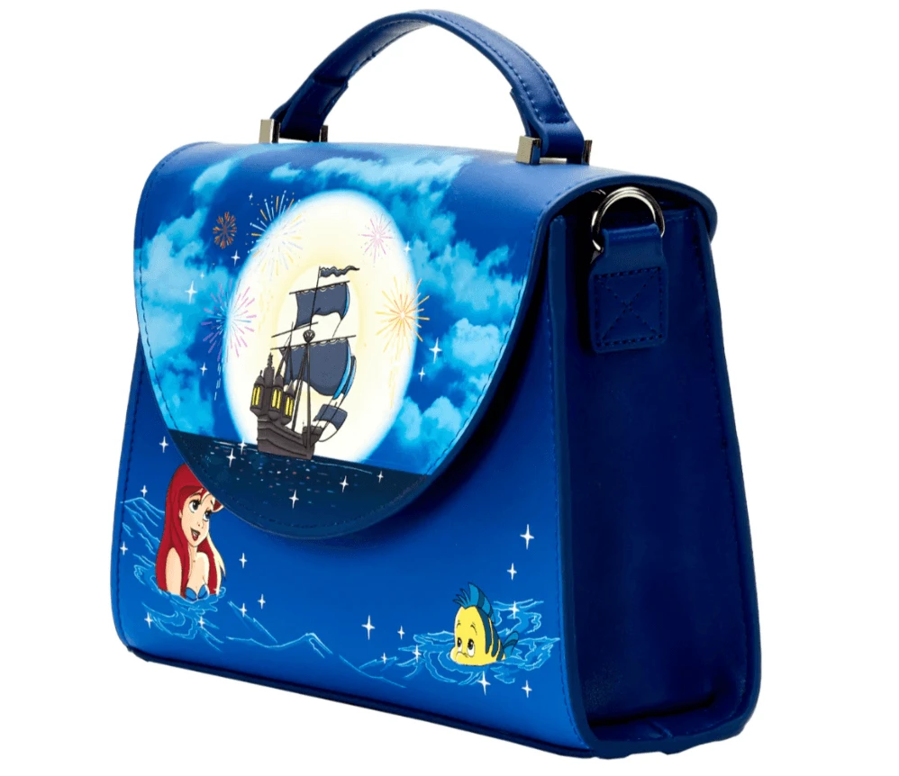 Show off your The Little Mermaid fandom with this The Little Mermaid Glow-in-the-Dark Crossbody Purse! It is made of faux leather and features a top flap closure, adjustable strap, matching themed lining, light-up fireworks, glow-in-the-dark, and printed details. This crossbody purse approximately measures 10-inches wide x 7-inches tall x 3-inches deep. Ages 15 and up.