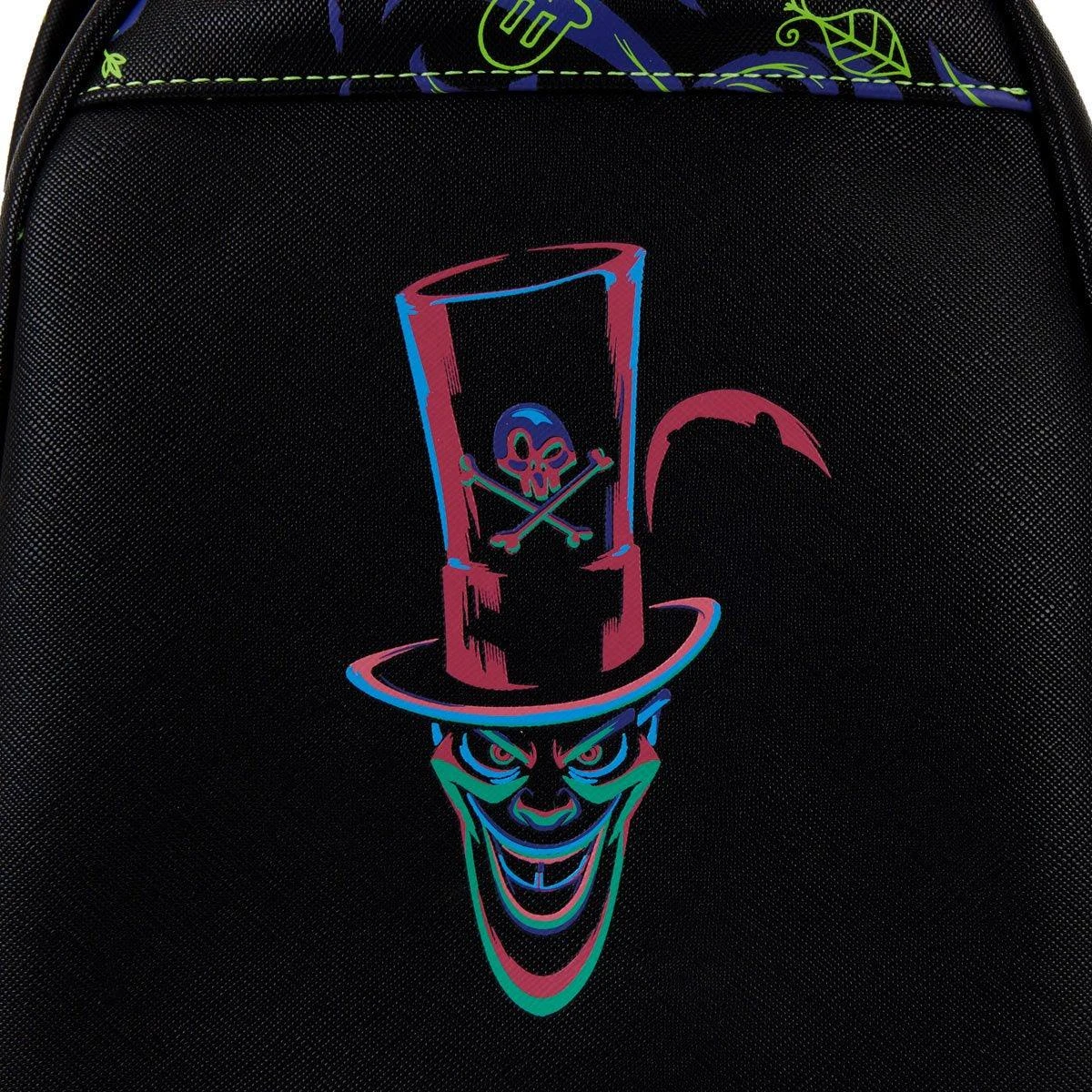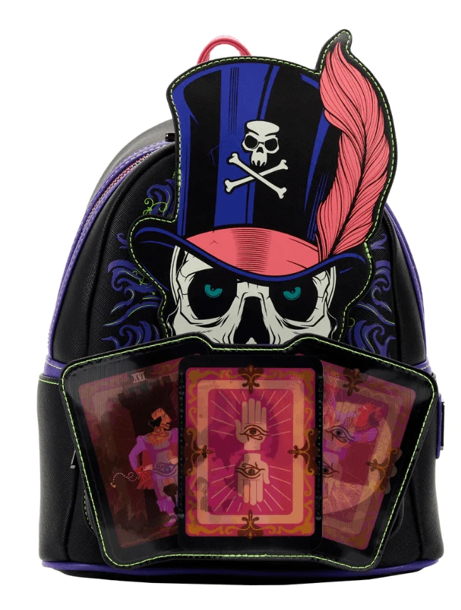 Conjure up a few friends from the other side to help carry you through the day with this The Princess and the Frog Dr. Facilier Glow and Lenticular Mini Backpack. On the front of the backpack, tarot cards wait to be turned over to reveal the future. Through sleight of hand, in an alternate view through the lenticular screen, the cards reveal hopeful wishes for Naveen. All the while, Dr. Facilier’s ominous hat and feather rise above the front zipped compartment–and glow-in-the-dark details bring him to life. In the dark, the skull and crossbones on the hat glow, and so do Dr. Facilier’s eyes and skull face. This accessory complements any Disney outfit and is perfect for Disney fans wishing to keep their favorite animated moments close.