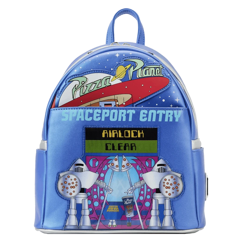 You are cleared to enter. Launch into a night of fun with the Loungefly Toy Story Pizza Planet Space Entry Mini Backpack. On the front zipper pocket, two robotic guards man the restaurant’s entrance. Shift the bag in the light to be granted access inside, where lenticular details reveal Buzz and Woody sneaking through the doors! The Pizza Planet building appears against a starlit sky, and the neon signs glow as day turns to night. On the back, the iconic spaceship logo soars through the sky. This mini backpack is ready to make a fashionable entry in your wardrobe and will keep your belongings safe as you refuel for your next mission.