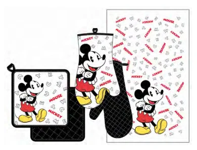 Bring home the simple charm of the Disney Chef Mickey Mouse kitchen set – Consists of 1 pot holder, 1 dish towel and 1 oven mitt – The set depicts Mickey Mouse – Displays a graphic print that reads, “Mickey”This machine-washable set is durably made from cotton in a green finish – This officially licensed Disney merchandise makes a great gift for Disney fans – Dish towel dimensions: 25″ x 16″Pot holder dimensions: 8″ x 8″Oven mitt dimensions: 7″ x 13” Material: linen.