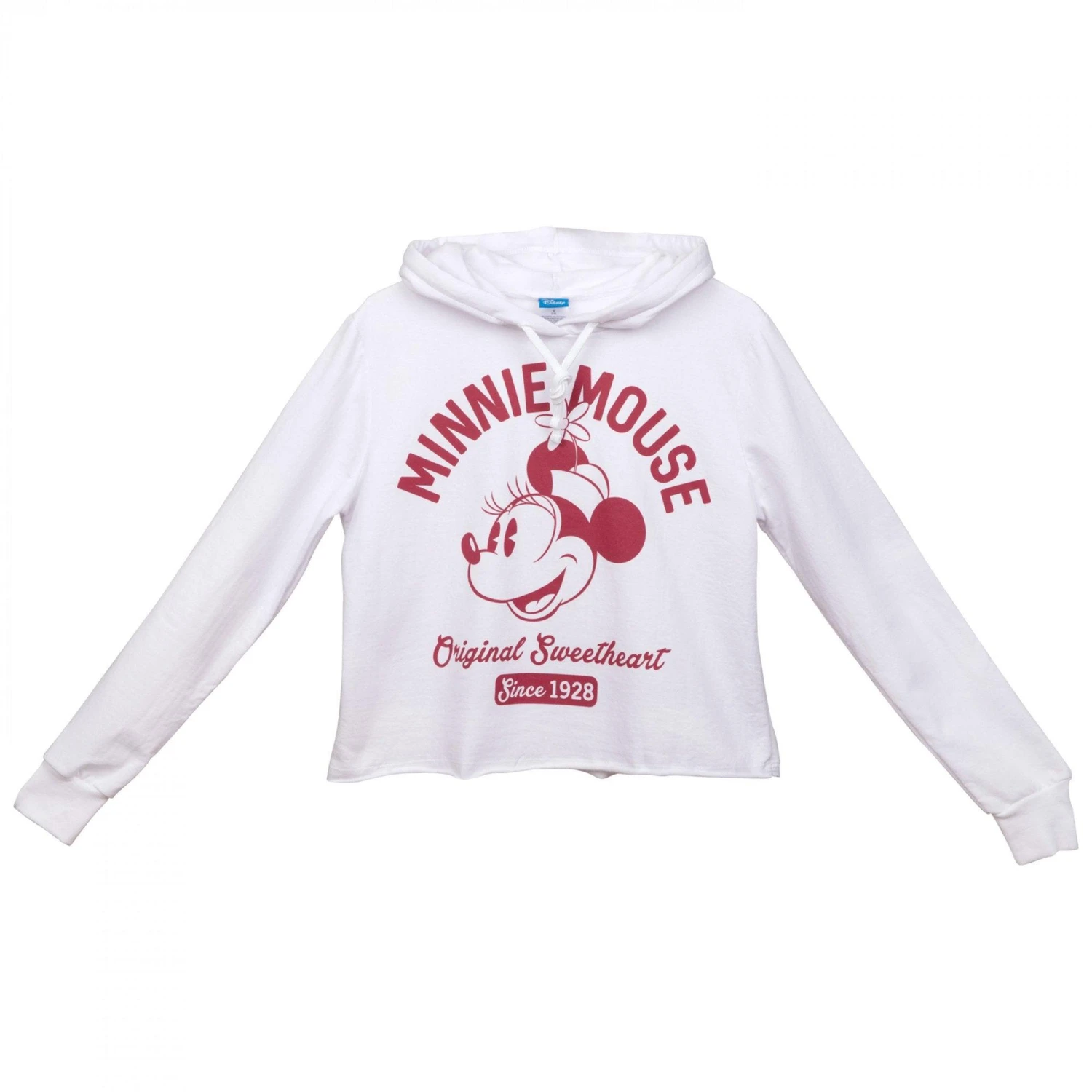 Grab one for yourself and everyone else. Officially licensed by Disney. Junior/teenage sizing; runs smaller/slimmer than regular women’s sizing. Disney Minnie Mouse Original Sweetheart Juniors Crop Hoodie. This white Disney Juniors Crop Hoodie is made from comfy fleece and features a cute Minnie Mouse Original Sweetheart character design.
