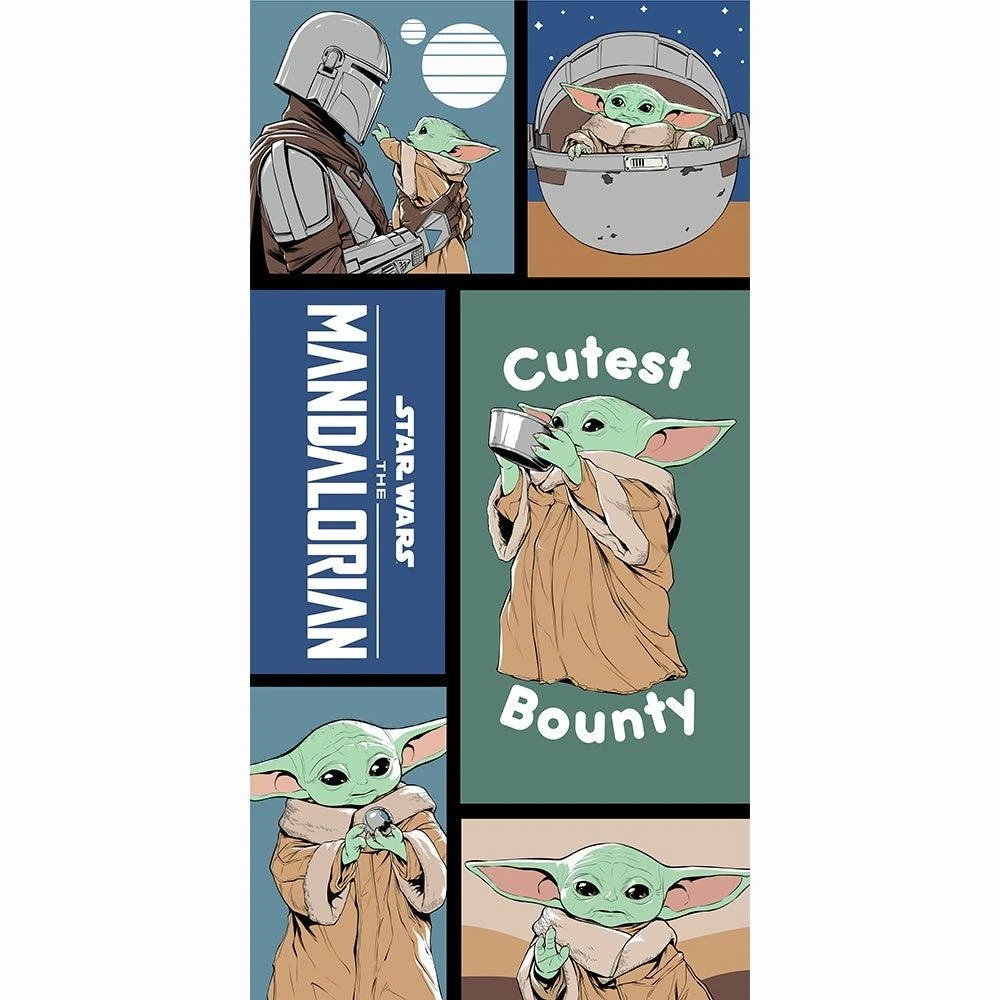 - Microfiber Towel featuring a print of Baby Yoda and the Mandalorian in various different moments of the show. Text reads “Star Wars The Mandalorian” and “Cutest Bounty”.
