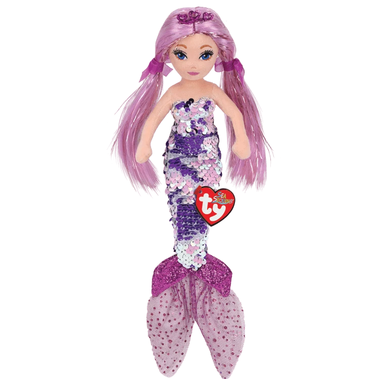 Watch me sparkle as I swim with colorful sequins glistening or flip them over then you’ll see a deeper purple twinkling. I have blue eyes and a fancy mesh tail that glitters with purple dotted detail. My silky long hair shines in sunny skies. I’m a pretty mermaid named Lorelei.